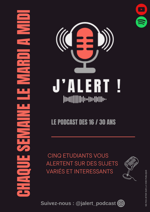 Nous avons créé en groupe un podcast intitulé "J'ALERT !" (avec nos prénoms comme inspiration : Juliette, Aglaé, Luigi, Emma, Renan), qui aborde des sujets de société. Nous avons enregistré un premier épisode, disponible sur Spotify et YouTube.